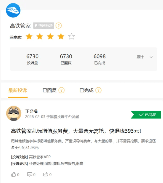检索黑猫投诉,截至2月3日,两大APP高铁管家和航班管家的投诉量累计高达数千条,问题也主要集中于勾选增值服务、退款慢、手续费不合理等。(港湾财经出品)
