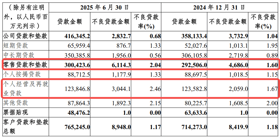 数据显示,该行零售贷款不良率从2024年末的1.6%上升至2025年上半年的2.04%,其中不良率最高的是个人经营及再就业贷款,2025年上半年达到2.46%。