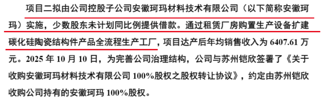 值得注意的是,在2025年10月,珂玛科技将安徽珂玛100%股权转让给苏州铠欣,导致安徽珂玛从“全资子公司”沦为“控股子公司”。然而,在安徽珂玛承担的扩产项目中,苏州铠欣少数股东由于自身资金情况等原因,并未计划同比例提供借款。