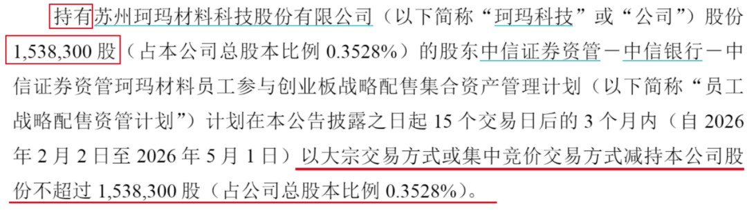 在珂玛科技股价涨到巅峰的前夕,公司股东就抛出了减持计划。2026年1月9日,珂玛科技披露,员工战略配售资管计划拟减持不超过153.83万股股份,如果顶格减持,员工战略配售资管计划将直接清仓。