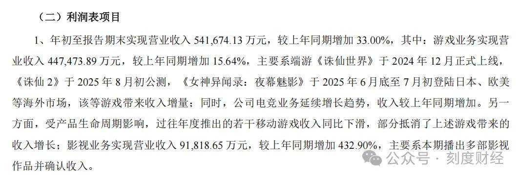 对比之下,完美世界的增长路径就显得单薄许多。2025年,三季度44.75亿元的游戏业务营收,妥妥的核心支柱,同比15.64%的影视业务营收9.18亿元,同比激增432.90%。