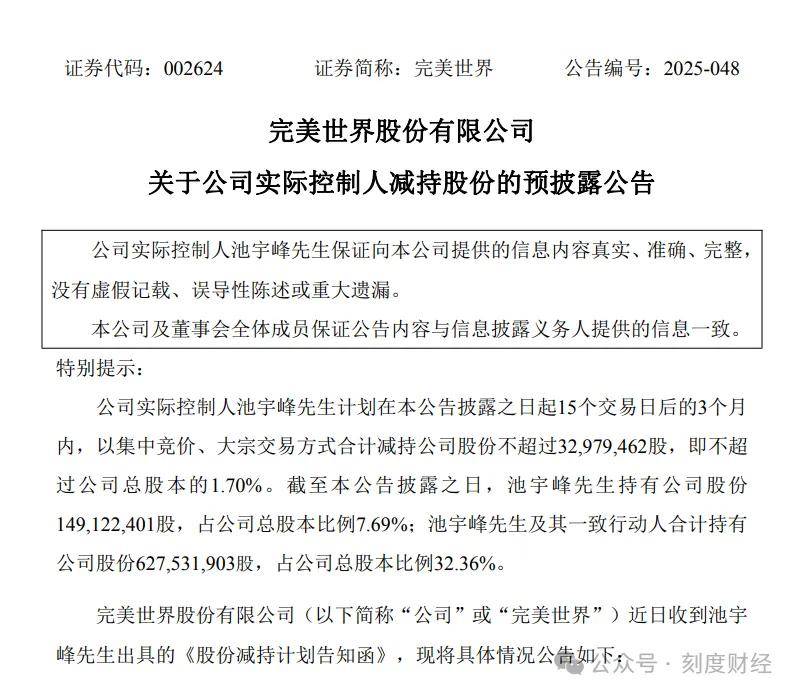 另一边,实际控制人池宇峰的减持公告来得猝不及防。2026年1月5日,实际控制人池宇峰动通过集中竞价和大宗交易合计抛出686万股,占公司总股本的0.35%。减持落地后,他与一致行动人完美世界控股、石河子快乐永久股权投资的合计持股比例,从32.35%悄然滑落至31.99%。