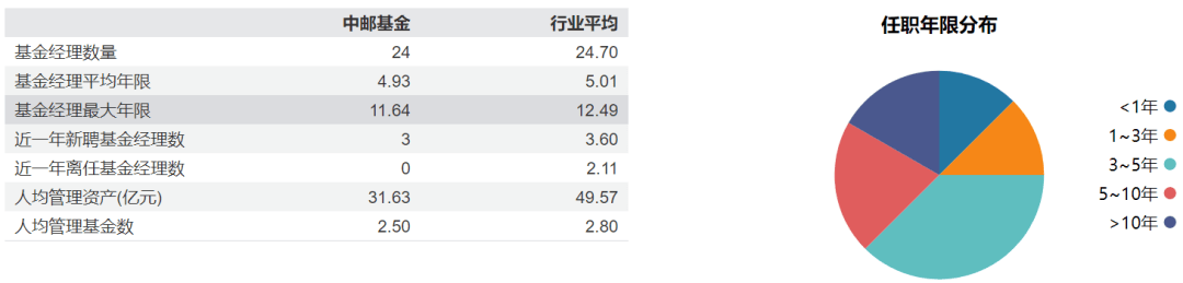 从Wind披露情况来看,中邮基金目前共有24位基金经理。其中,任职基金经理年限超过10年的有3位,年限不足5年的有15位。此外,3位基金经理在2025年9月后刚任职。